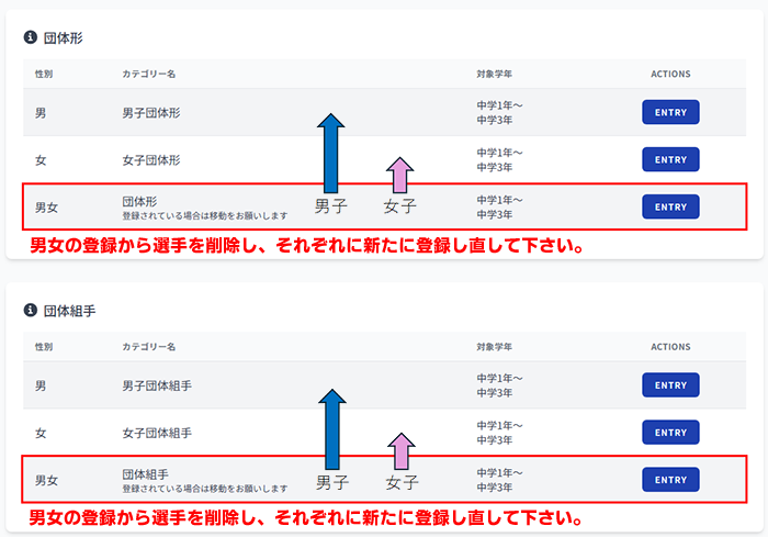 システムの不具合により、中学生男女団体戦、形、組手のエントリーのやり直しをお願いいたいます。
